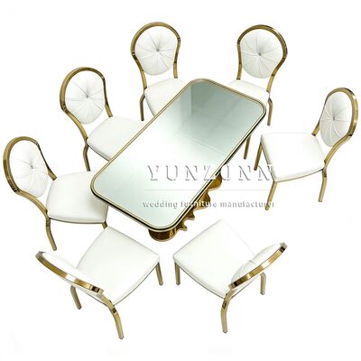Q3: What is the material of your products? A3: Table and chair stainless steel frame,toughened glass on the table; marble or wood. The chair cushions are made of high density sponges and high quality leather or cloth.
